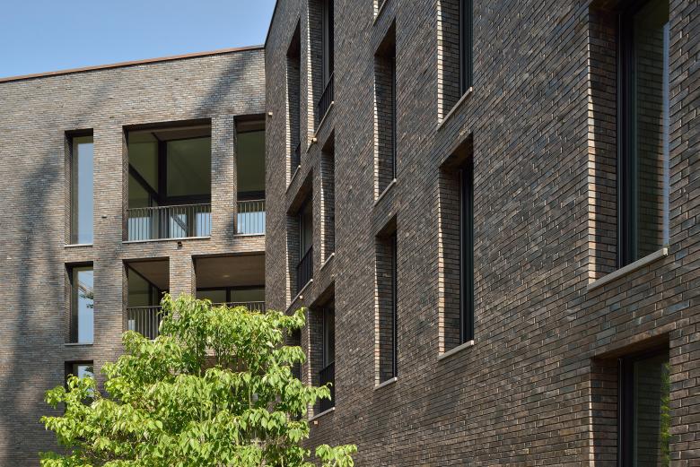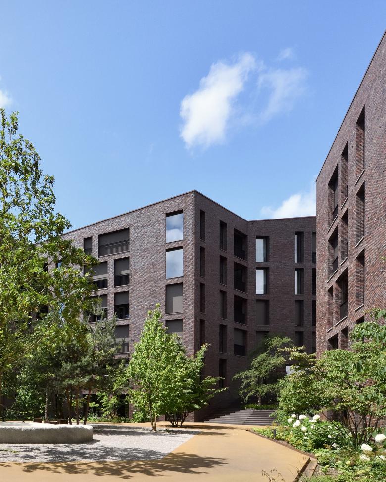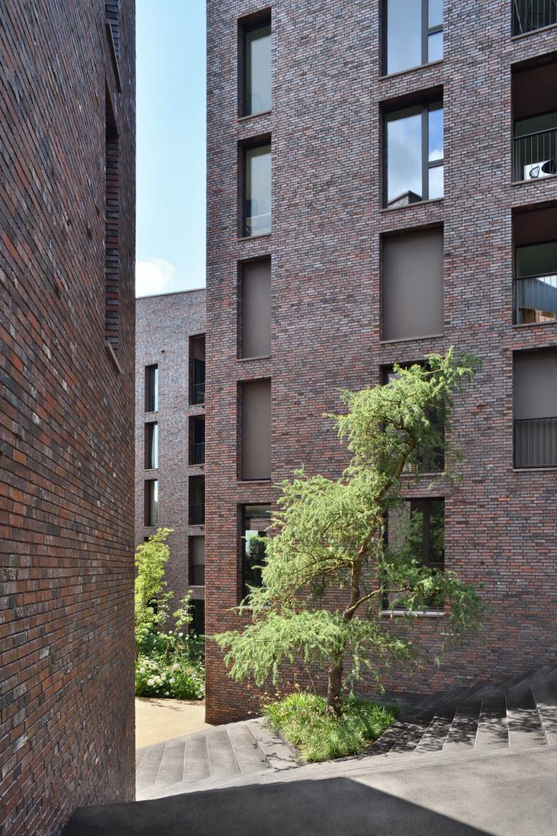 Die abgewinkelten Fassaden strukturieren die Baukörper und lassen spannungsreiche Zwischenräume entstehen. Die Verwendung von über 650’000 Klinkersteinen – gebrannt in einem der letzten traditionellen Ringöfen – verankert das Projekt materiell und atmosphärisch im historischen Kontext des ehemaligen Werkplatzes der Eugen Schäfer AG. Jeder Stein ist ein Unikat und macht die Gebäudehülle zu einer lebendigen, handwerklich geprägten Oberfläche von hoher ästhetischer Tiefe.