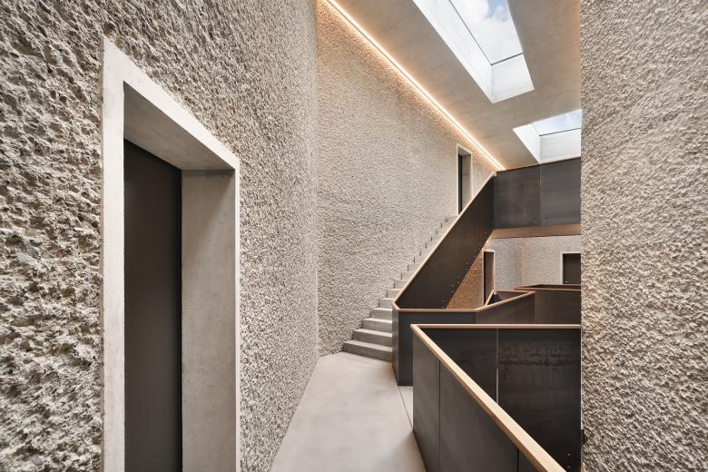 Die vertikale Erschliessung wird zum architektonischen Erlebnisraum: polygonale Treppenhäuser mit Lufträumen, Oberlichtöffnungen und roh belassenem, grob gespitztem Ortbeton verleihen dem Material eine sinnliche, fast landschaftliche Qualität. So wird das Schäfer Areal zur Verbindung von Tektonik, Materialität und Atmosphäre – ein architektonisches Statement im Zentrum von Dielsdorf.