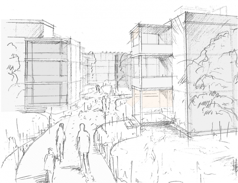 Die ortsbauliche Setzung beruht auf der differenzierten Anordnung von Punktbauten, ähnlich der südlich angrenzenden Nachbarbebauung. Diese fügen sich in der perspektivischen Wahrnehmung zwischen räumlich dichten und weiten Situationen zu einer einheitlichen feinkörnigen Bebauungsstruktur.
