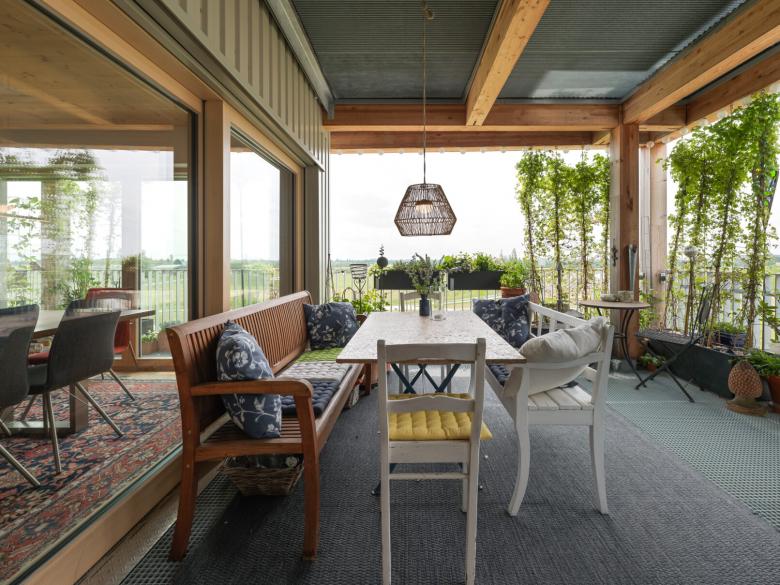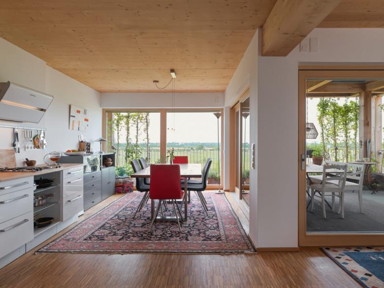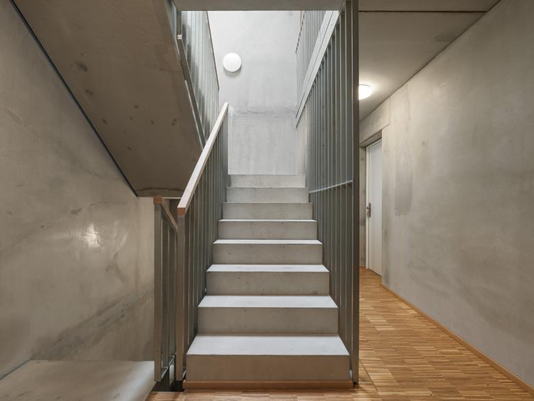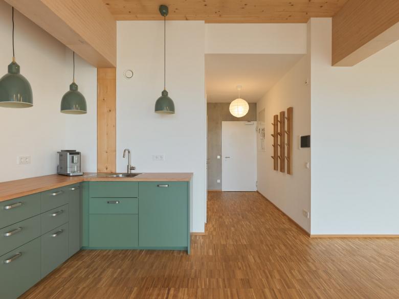 Das Gebäude wurde als vorgefertigter Holzbau mit raumhohen Elementen aus Vollholz, Brettschichtholz und Kreuzlagenholz errichtet. Die Wohnungen sind intelligent verkleinert, ohne dass dabei Wohnqualität eingebüßt wird. DGJ Architektur hat eine flexible Wohnbebauung in elementierter Holzrahmenbauweise mit Stahlbeton-Treppenkern entworfen. Diese kombiniert unterschiedliche Wohnungsgrößen von 2- bis 5-Zimmer-Wohnungen. Da zum Zeitpunkt des Entwurfs noch nicht alle Mitglieder der Wohngruppe feststanden, sollte das Gebäude so konzipiert werden, dass im Austausch mit den aktuellen und zukünftigen Bewohner:innen möglichst viele verschiedene Wohnungsgrößen und Wohnkonzepte umgesetzt werden können. Im Hinblick auf die Anforderungen der Wohngruppe wurde gemeinsam mit den zukünftigen Bewohner:innen entschieden, die Wohnungen auf einem Raster von 3,03 m × 3,0 m zu planen. Ein gleichmäßiges Rastermaß bietet Vorteile für die Vorfertigung, die Materialeffizienz und die Bauabläufe, auch wenn die Grundrisse selbst nicht streng regelmäßig sind.