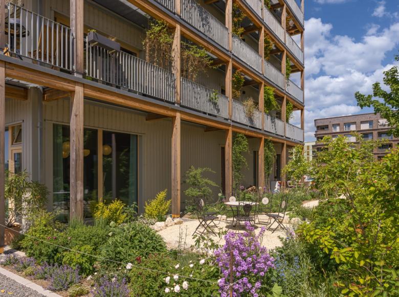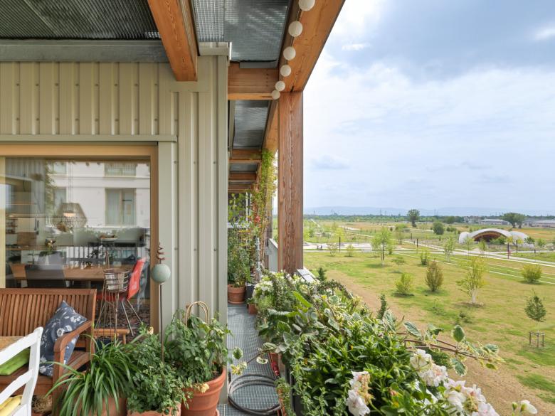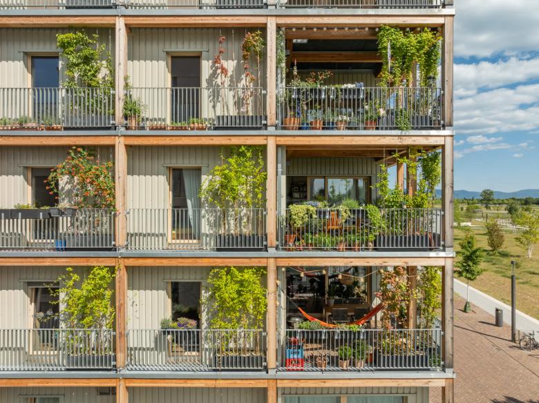 DGJ Architektur hat in einem vom Bundesinstitut für Bau-, Stadt- und Raumforschung (BBSR) geförderten Forschungsprojekt speziell für das „WohnWerk“ ein „Low-Tech“-System für die Fassadenbegrünung entworfen. Es kann von den Bewohner:innen selbst gepflegt werden und ist leicht auf andere Bauprojekte übertragbar. Da nur wenige aktive Komponenten notwendig sind, ist die Anlage energieeffizient und wartungsarm. Pflanzkästen mit Substrat sichern eine ganzjährige Artenvielfalt. Die intensive Begrünung der Fassade, inspiriert durch die räumliche Nähe zum ehemaligen BUGA23-Gelände, setzt das Thema „Grün” fort und verbessert die ökologische Qualität des Stadtraums.