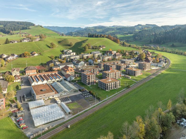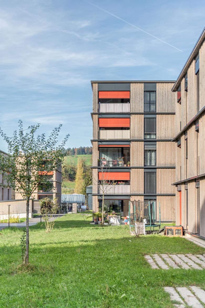 Das Planungsgebiet befindet sich am Ortsrand von Bärau in einer Senke zwischen der Bäraustrasse und den Bahngleisen. Das angrenzende Gebäudeensemble der ehemaligen Lauterburg-Fabrik prägt den Ort und hat einen hohen Identifikationswert. Insbesondere die alte Zettlerei ist aus dem Strassenraum stark spürbar. Die neue Überbauung an der Bäraustrasse wird präzise in diese sensible Nachbarschaft eingepasst. Zwei Wohnzeilen bilden den Auftakt und somit auch eine adäquate Adresse für das neue Quartier. Das städtebauliche Muster, bestehend aus drei unterschiedlichen Baukörpern, ist in der Höhe von 3 bis 5 Geschossen gestuft. Die versetzte Anordnung der Gebäude ermöglicht spannende Durchblicke und Durchwegungen und eröffnet den Bewohnern Ausblicke in die umliegende Landschaft. Die Baukörper werden durch drei Höfe zu Baugruppen zusammengebunden. Diese lehnen sich an die regional typischen Baugruppen der landwirtschaftlichen Gehöfte an und schaffen für deren Bewohner Identität und Massstäblichkeit. Die gesamte Siedlung wird durch das sorgfältige Einbetten in die Landschaft hindernisfrei gestaltet.