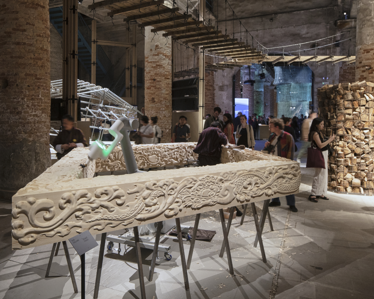 Ancient Future: Bridging Bhutan's Tradition and Innovation was one of the more performative pieces in the Biennale during the vernissage and ahead of its opening on May 10. The carvings visible on the sides of the beams were completed ahead of the Biennale, but two Bhutanese woodcarvers—Sangay Thsering and Yeshi Gyeltshen, per BIG—worked on the top surfaces, while a robotic arm cleared away wood shavings and dust. Although the film shows the robotic arm working with drill bits, safety concerns in Venice led the team to equip it with just a brush.