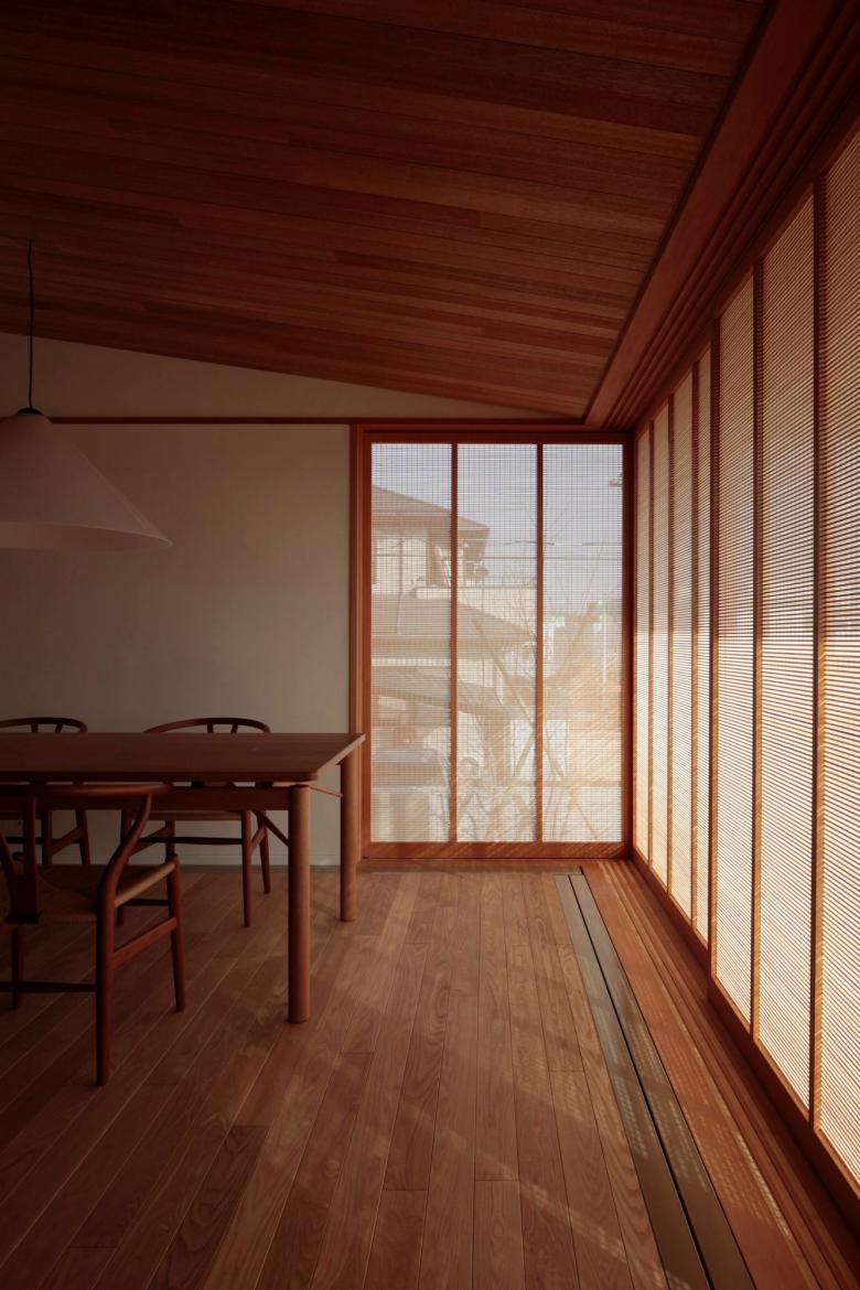 The large opening on the south side of the living/dining room is fitted with sliding shoji doors and wooden blinds, so that the room can be set up in a way that is comfortable for each season. Top lights above the entrance and in the bedrooms allow light to fall on the back of the building. The light is bounced around by the soft Oya stone, the plaster which reflects the light, and the dull shiny lauan wood of the ceiling, enveloping the entire space.